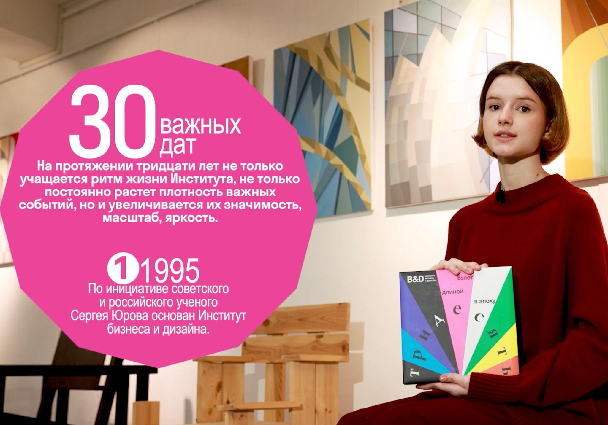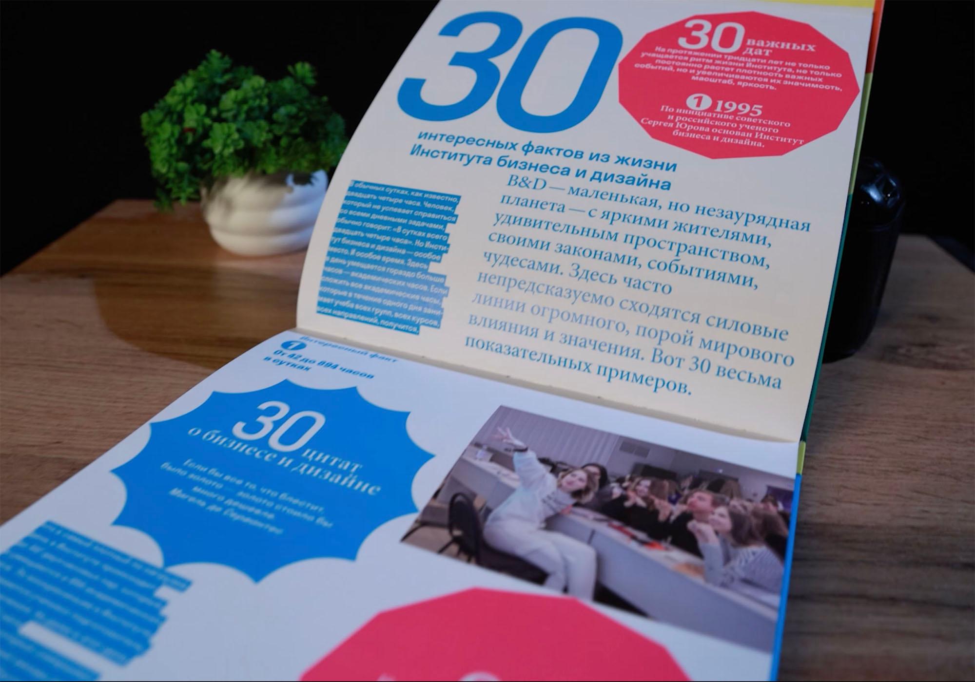 Второе событийное издание «Тридесять. Взлёт длиной в эпоху» посвящено самым ярким фактам и событиям Института бизнеса и дизайна. Это не просто хронология, а масштабный труд, в котором собраны редкие архивные материалы, фотографии, уникальные документы, истории преподавателей и руководителей направлений, студенческие проекты и ключевые события, определившие путь B&D.