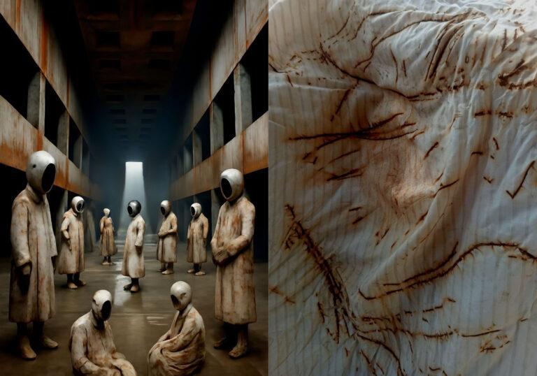 Когда в моём родном казахском городке все с упоением смотрели современные хорроры, я влюблялся в фильмы Гильермо Дель Торо и Паскаля Ложье. Меня интересовал сюрреализм Дали, Магритта и Миро. Я погружался в мрачное творчество любимого художника Здзислава Бексиньского и чувствовал, что и моему воображению близки темы тревоги, страха и провокации. Помимо исследований человеческой психики, я стал искать свой стиль среди текстильных фактур и мельчайших деталей процессов разрушения и распада.