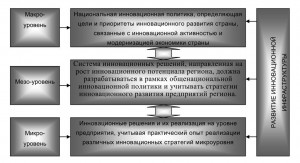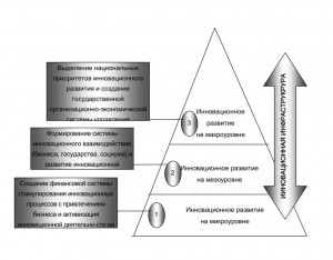 Инновационное развитие актуально на всех уровнях управления, при этом на макроуровне происходит выделение национальных приоритетов инновационного развития и создание государственной организационно-экономической системы управления инновационными процессами по структуре их использования; на мезоуровне – формирование системы инновационного взаимодействия (бизнеса, государства, социума) развитие инновационной деятельности в регионах; на микроуровне - создание финансовой системы стимулирования инновационных процессов с привлечением бизнеса активизация инновационной деятельности на предприятиях промышленности.