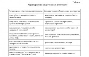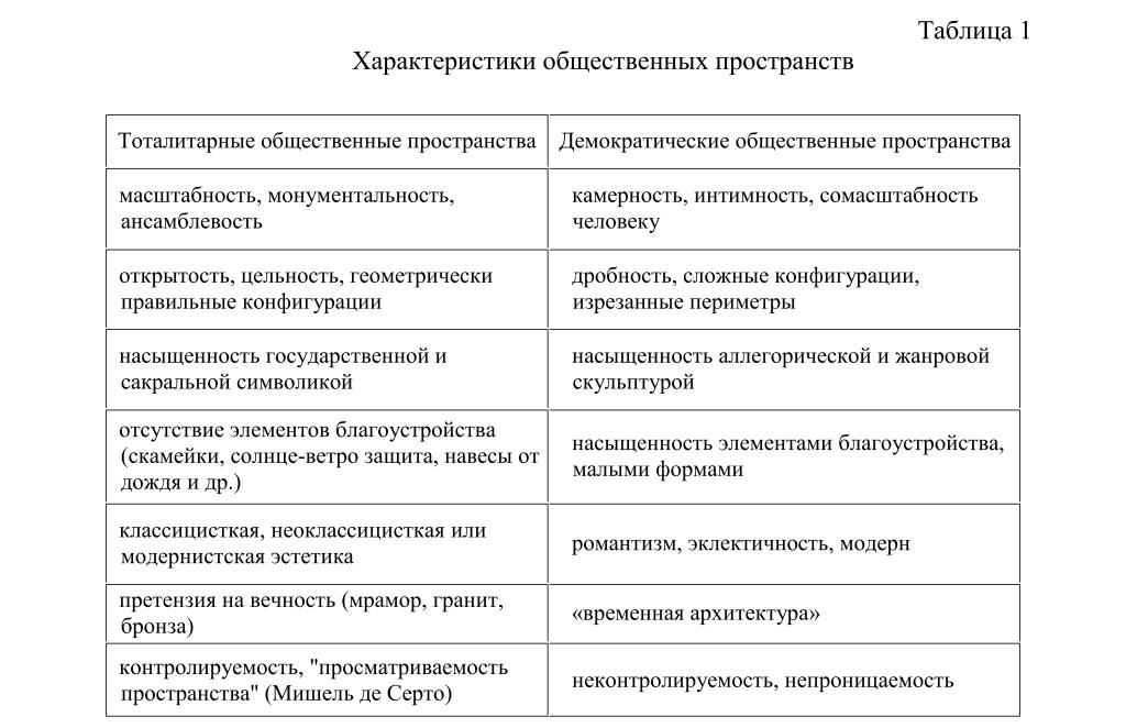 Для наглядности сравнительные характеристики тоталитарных и демократических общественных пространств сведены в таблицу 1.