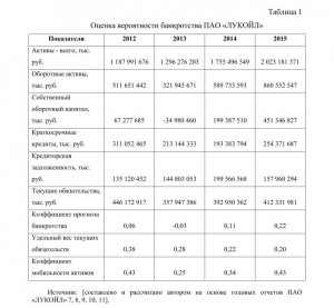 Коэффициент прогноза банкротства за период 2012-2014 гг. очень низок (менее 0,14), что позволяет утверждать, что вероятность банкротства для ПАО «ЛУКОЙЛ» высока. Однако в 2015 г. ситуация улучшилась и хотя угроза банкротства и сохранилась, однако вероятность его наступления уменьшилась.