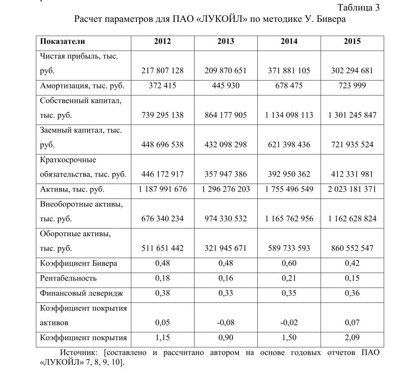 Анализируя таблицу полученных показателей, можно сказать о том, что данная методика позволяет сделать неоднозначный вывод о степени банкротства ПАО «ЛУКОЙЛ». Так по У. Биверу, по состоянию на конец 2015 г. показатели рентабельности и коэффициент покрытия активов говорят о том, что компания может дойти до степени банкротства как за год, так и за пять лет соответственно (в период 2012-2014 гг. коэффициент покрытие не давал положительного результата). Однако сам коэффициент Бивера и финансовый леверидж лежат в пределах стабильности финансового состояния компании.