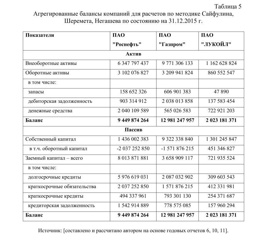 Далее нужно рассчитать с помощью агрегированных балансов эти показатели для компаний, участвующих в рейтинговой оценке. В следующей таблице приведен агрегированный баланс по трем нефтегазовым компаниям.