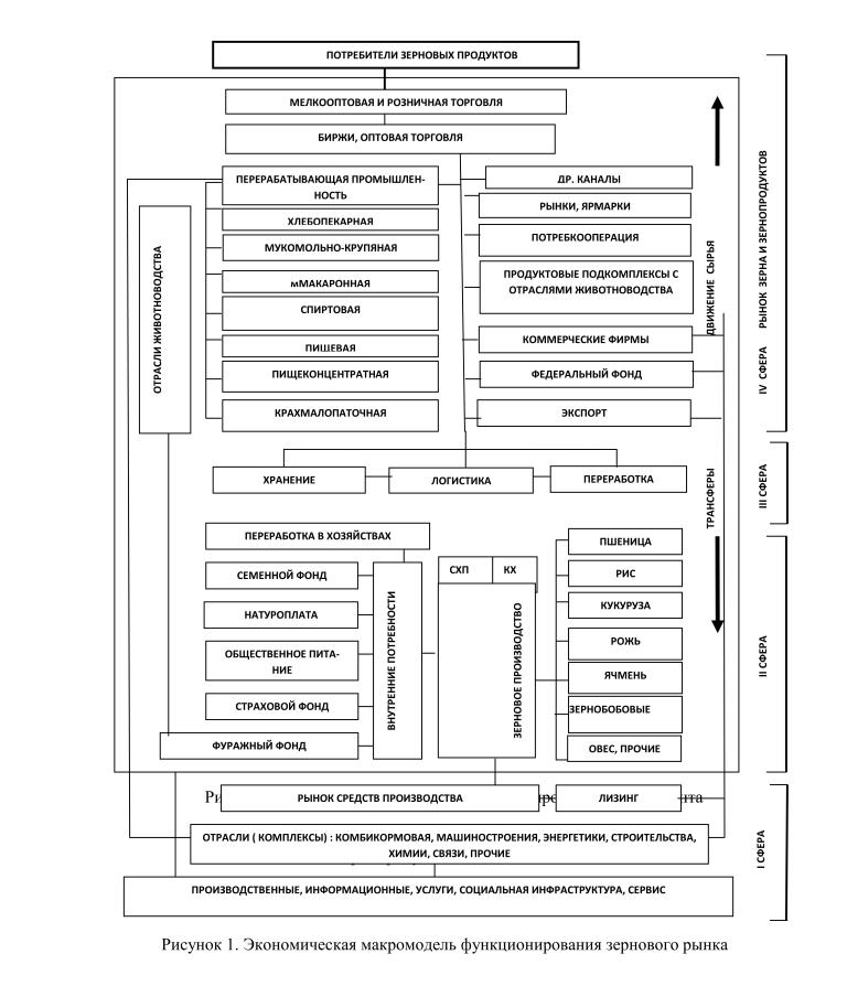 Под «зерновым рынком» авторы понимают интегрированный механизм, охватывающий производство - переработку - логистику - маркетинг зерновых продуктов, обеспечивающий выход на потребителя. Авторы отмечают, что сегодня не следует проводить жесткие границы в менеджменте сегментов зернового рынка, так как все отрасли этого рынка технологически связаны между собой через совокупность интегрированных видов деятельности. Также они приводят свою модель менеджмента функционирования зернового рынка, в которой наглядно демонстрируются основные блоки исследуемой производственной системы, их связи и взаимоотношения.