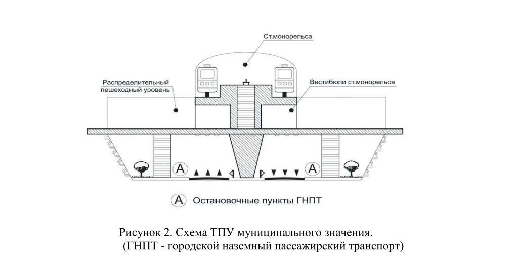 В ТПУ муниципального значения обычно три уровня: нижний (первый) предназначен для движения городского транспорта (индивидуального, грузового, наземного пассажирского), средний (второй) отводится пешеходам; на верхнем (третьем) расположена станция монорельса.