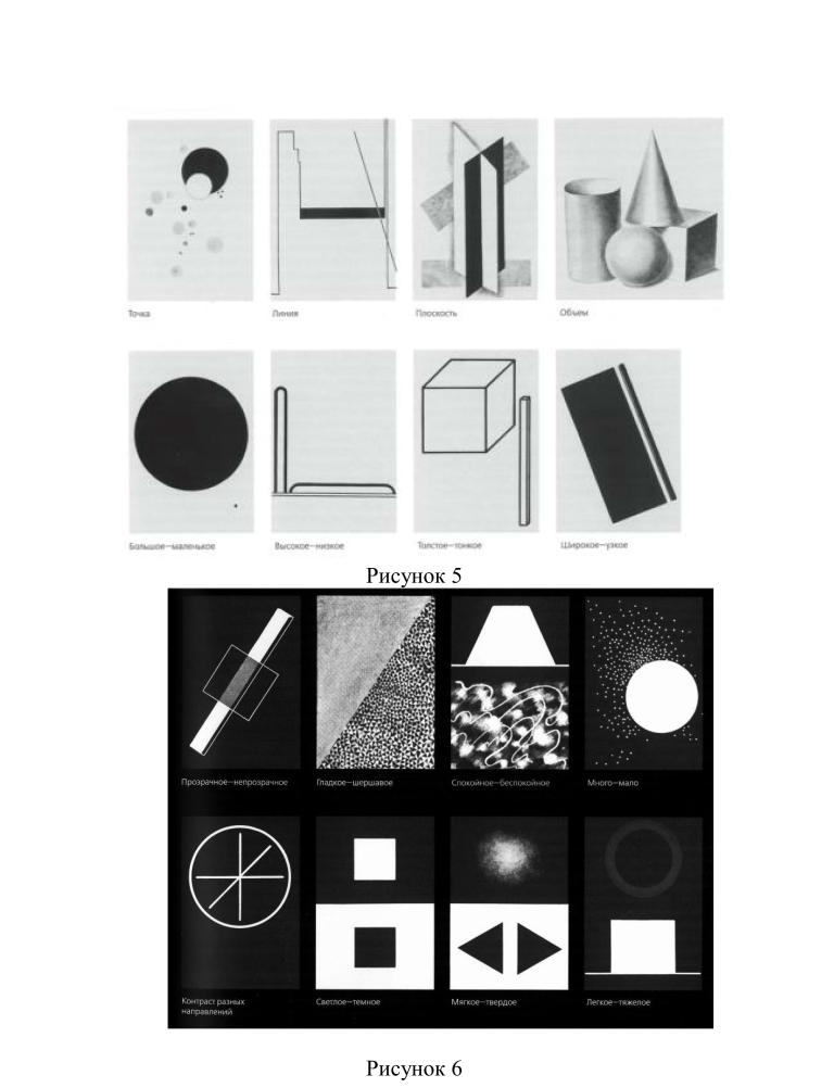 Такими контрастами являются: большое — маленькое, длинное — короткое, широкое — узкое, толстое — тонкое, черное — белое, много — мало, прямое — изогнутое, острое — тупое, горизонтальное — вертикальное, диагональное — круговое, высокое — низкое, площадь — линия, поверхность — объем, линия — тело, точка — линия, гладкое — шершавое, твердое — мягкое, неподвижное — движущееся, легкое — тяжелое, прозрачное — непрозрачное, сплошное — прерывистое, жидкое — твердое, сладкое — кислое, сильное — слабое, громкое — тихое, а также семь цветовых контрастов (рисунки 5 и 6).