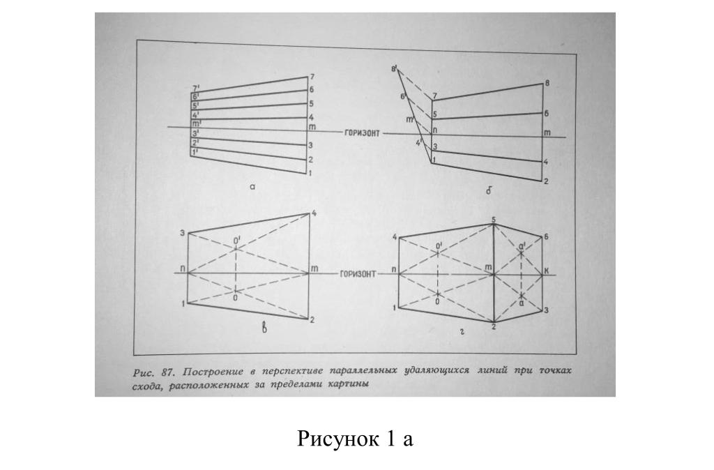 Иногда при работе над картиной встречается необходимость разметить равные расстояния на линиях (рисунки 1, 2, 3), удаляющихся к точке схода. Также можно определить интервалы между столбами, расположенными под любым углом к картинной плоскости [6, с. 113].