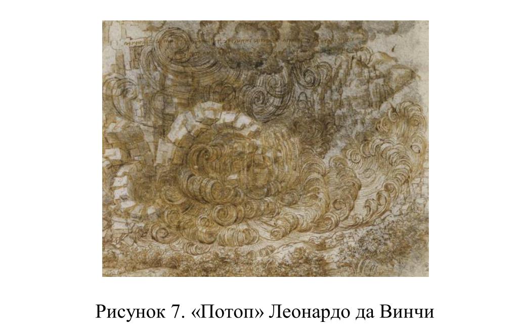«В "Потопе" (рисунок 7) Леонардо элементы чисто пластические (то есть зрительные); элементы поведения людей (то есть драматически игровые); элементы шумов, грохота и  воплей (то есть звуковые) - все в одинаковой мере слагаются в единый обобщающий конечный образ представления о потопе» [6, с. 10].