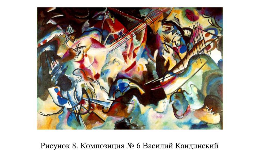 Вероятно, и Композиция № 6 (рисунок 8) В. Кандинского с одноименным названием «Потоп» создавалась не без учета тех самых выразительных средств, которые вытесняя сознательный конкретный объект с холста, оставляла весь его ассоциативный, графический, музыкальный образ.