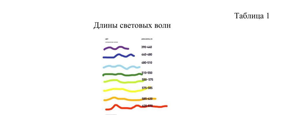 Каждый цвет спектра характеризуется длиной световой волны, то есть он может быть совершенно точно задан длиной волны или частотой колебаний. Световые волны сами по себе не имеют цвета (табл. 1). Другими словами, мы видим цвет, только потому, что есть свет [5. с. 181].