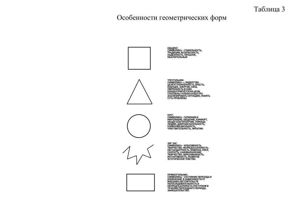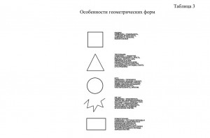 Например, в США была разработана система психогеометрии, автором которой является Сьюзин Деллингер, специалист по социально-психологической подготовке управленческих кадров. Согласно данной системе, существует пять психогеометрических форм личности: квадрат, треугольник, круг, прямоугольник, зигзаг. Психогеометрические формы личности можно определить с помощью теста. Мы вкратце рассмотрим характерные особенности каждой из этих основных геометрических форм.