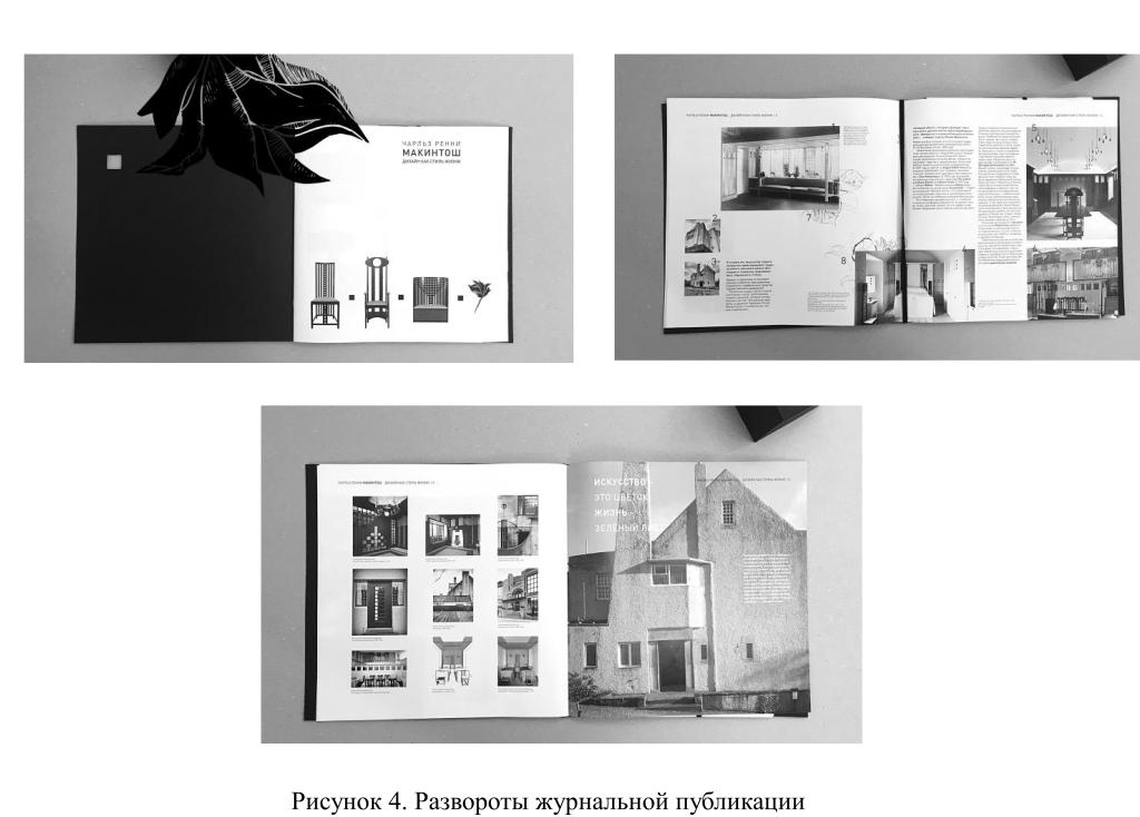 Вначале на примере публикации про архитектора Чарльза Ренни Макинтоша, проанализируем то, как  его творчество перекликается с версткой. Чтобы создать публикацию, необходимо было более подробно изучить творчество мастера. Многое из того, что узнали о нём, попытаемся внести в  издание. Работы Ч. Макинтоша в целом принадлежат по своей̆ стилистике к модерну. Он стал новатором конструктивной̆ линии модерна с характерной̆ для неё прямолинейностью форм и их ясным построением. Его мастерство было основано на типично столярной̆ геометрически прямолинейной конструкции с преобладанием вертикальных линий. Исходя из всего этого можно предположить, что публикация, посвященная автору, должна быть такая же геометричная и достаточно простая, как он сам. В ней должна быть звонкость от композиции. Текстовые блоки и изображения должны взаимодействовать друг с другом, но не мешать. Они должны подчеркивать некую аскетичную, но изысканную простоту, которая свойственна Ч.Р. Макинтошу. К тому же он был таков во всем: в графике, в дизайне интерьера, в архитектуре. Формат публикации был выбран квадратный̆ (295 мм x 300 мм). На наш взгляд, это очень архитектурный̆ формат. Но для архитектора, который̆ использует квадрат, как основу многих своих объектов (особенно мебели) - это является просто идеально. Ч. Макинтош воспринял форму квадрата как структурный̆ элемент дизайна. Геометрические формы – прямоугольники и квадраты – определяют большую часть декора архитектора. Чарльз Макинтош любил цветы и писал огромное количество акварельных гербариев. Мы решили включить в публикацию элементы цветов из его работ. Тему цветов мы постарались пропустить через всю публикацию. Так, чтобы она помогла лучше понять архитектора (рисунок 4).