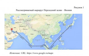 - Рассмотрен маршрут Персидский залив – Япония (рисунок 1). Протяженность маршрута составляет 12 411 км (7712 миль). Класс танкера VLCC.