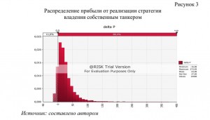 Рыночная ставка фрахта моделировалась логарифмически нормальным распределением с параметрами: среднее – 31,56 (долл./день), стандартное отклонение – 26,7 (долл./день). Поиск подходящего закона распределения был осуществлён с помощью программы @ RISK (модуль фитинга).