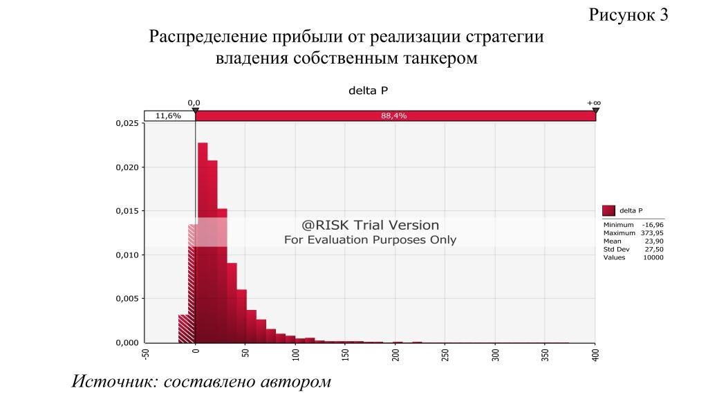 Расчет по модели был осуществлен с помощью метода сценарного моделирования - Монте – Карло. В этих целях был использован пакет @ RISK. Было осуществлено 10 000 итераций. В результате моделирования десяти тысяч сценариев была смоделирована разница между рыночной фрахтовой ставкой и рентабельной ставкой фрахта, обеспечивающая доходность для владельца судна. Как видим из рисунка, в 88 % сценариев зафиксировано превышение рыночной ставки фрахта над ставкой рентабельности. Если для компании 12 % вероятность убытка является допустимой, то в таком случае очевидно преимущество стратегии 2.