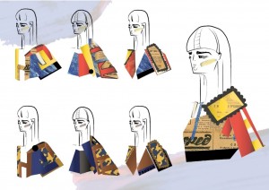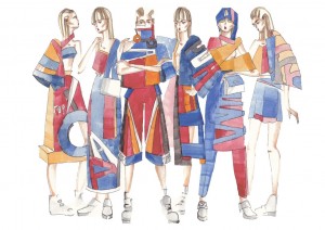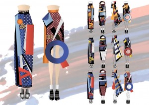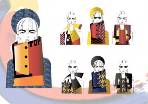 Выявив определенный принцип работы, началось выполнение технических рисунков поясных изделий. Крой должен быть простым и лаконичным, изделия – удобными в носке, но, одновременно, «заявляющими о себе» (рисунок 3). Цветовая палитра была определена, основываясь на колорите творческого источника – это яркие, сочные цвета, которые в комбинации друг с другом смотрелись бы гармонично и свежо. Так же, «слова» и «буквы» нашли свое место в принтах изделий – это паттерн уже пожелтевшей газеты с лозунгами и заголовками (рисунок 4). Изначально определив характер и пластику изделий, выбраны за основу такие материалы, как деним, сетчатая ткань, вставки из эко-кожи.
