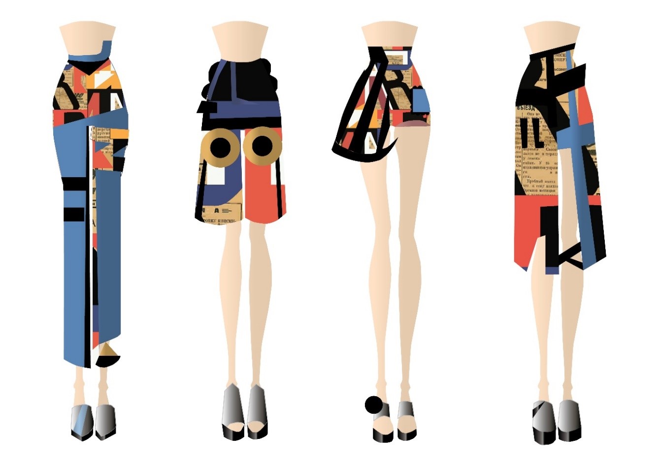 Выявив определенный принцип работы, началось выполнение технических рисунков поясных изделий. Крой должен быть простым и лаконичным, изделия – удобными в носке, но, одновременно, «заявляющими о себе» (рисунок 3). Цветовая палитра была определена, основываясь на колорите творческого источника – это яркие, сочные цвета, которые в комбинации друг с другом смотрелись бы гармонично и свежо. Так же, «слова» и «буквы» нашли свое место в принтах изделий – это паттерн уже пожелтевшей газеты с лозунгами и заголовками (рисунок 4). Изначально определив характер и пластику изделий, выбраны за основу такие материалы, как деним, сетчатая ткань, вставки из эко-кожи.