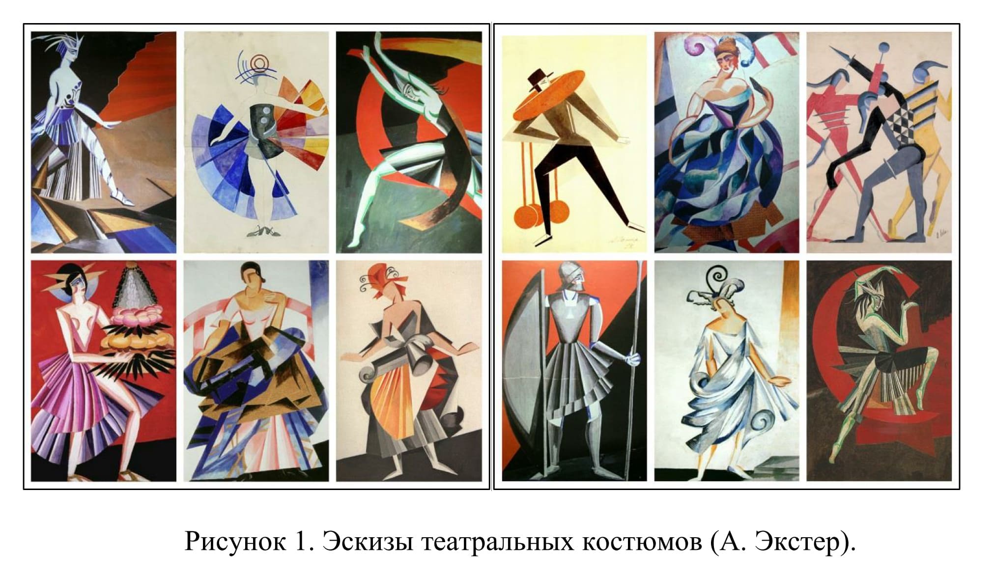 1) Поисково-исследовательский этап. На этом этапе формулировались задачи, определялось направление поиска и анализ проблемы, производились сбор, изучение и обработка информации, а также уточнялся последовательный план проектной деятельности. Важным моментом стал выбор «точки отправления» - источника вдохновения. Вдохновить дизайнера на создание новых образов может любое явление или предмет из прошлого или настоящего времени [1, c. 20]. Студентам было предложено познакомиться с творчеством яркой представительницы русского авангарда Александры Экстер и определиться с выбором источника среди предложенного многообразия театральных эскизов художницы (рисунок 1).