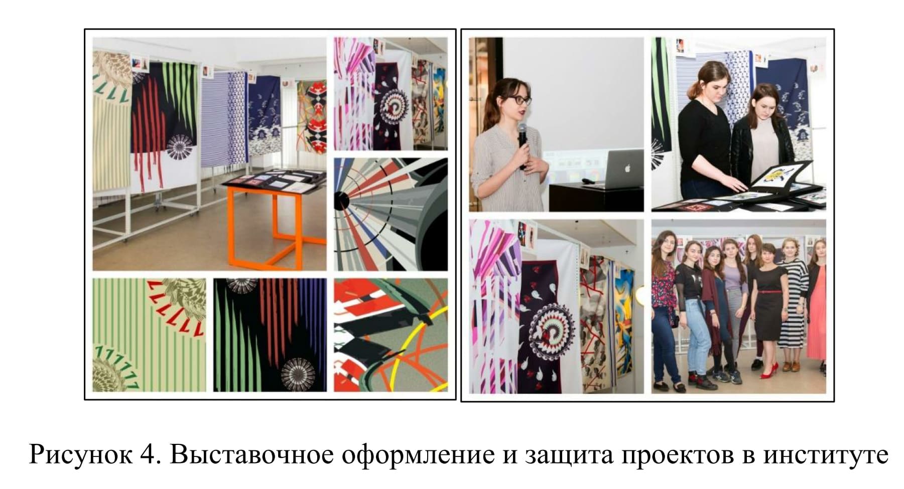 3) Презентационный этап. На этом этапе происходило финальное оформление проектов и подготовка их к выставке. В рамках итогового просмотра на кафедре дизайна костюма проводилась итоговая оценка качества реализации проекта (выполненных отчетных творческих папок с эскизными работами и изготовленных купонов тканей), включая выставочное оформление и презентацию изделий. Студентами был представлен анализ результатов выполнения темы в форме защиты презентаций, а также изучены возможности использования объектов проектной деятельности, реального спроса на рынке товаров, участие в дизайнерских конкурсах и выставках.