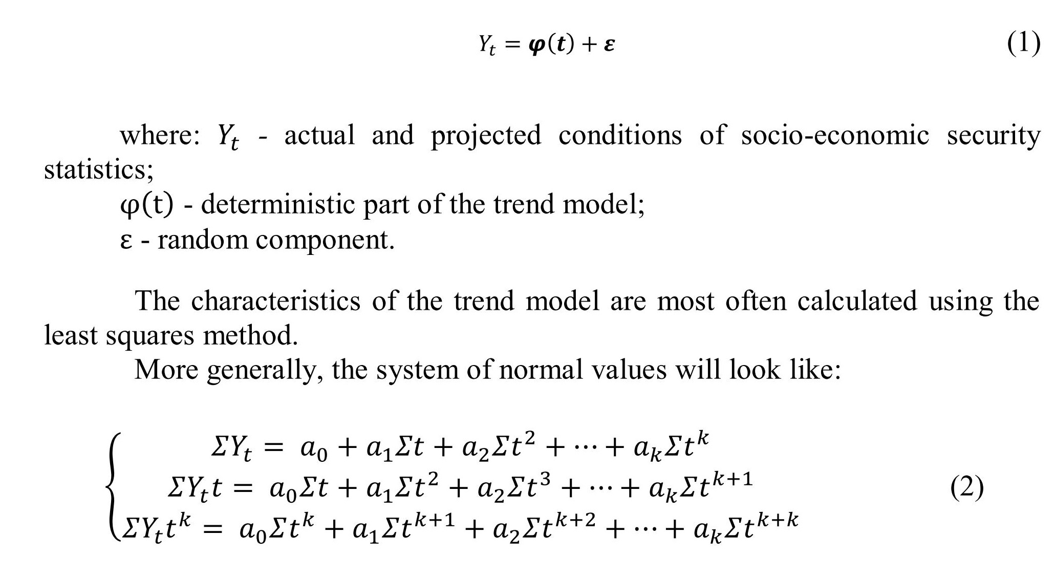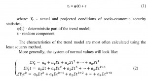 The basic works on the problem of management do not fully address the issues of socio-economic security, and even more so in terms of the use of adequate tools and methods. Until now, the quality and difficulties of the socio-economic system have been little studied in the scientific literature, which affects the subject field of socio-economic security [1, p.93]. Identification of fresh qualities of the system associated with its structure and largely determine its behavior would allow to form a model of management opinions of a different level and other properties, because. it reveals a wide range of possibilities for mathematical and computer modeling, forecasting the widespread use of computational technologies. To fill the provided spaces with the purpose of forecasting the statistical characteristics of the socio-economic security apply trend models [2, p. 161].