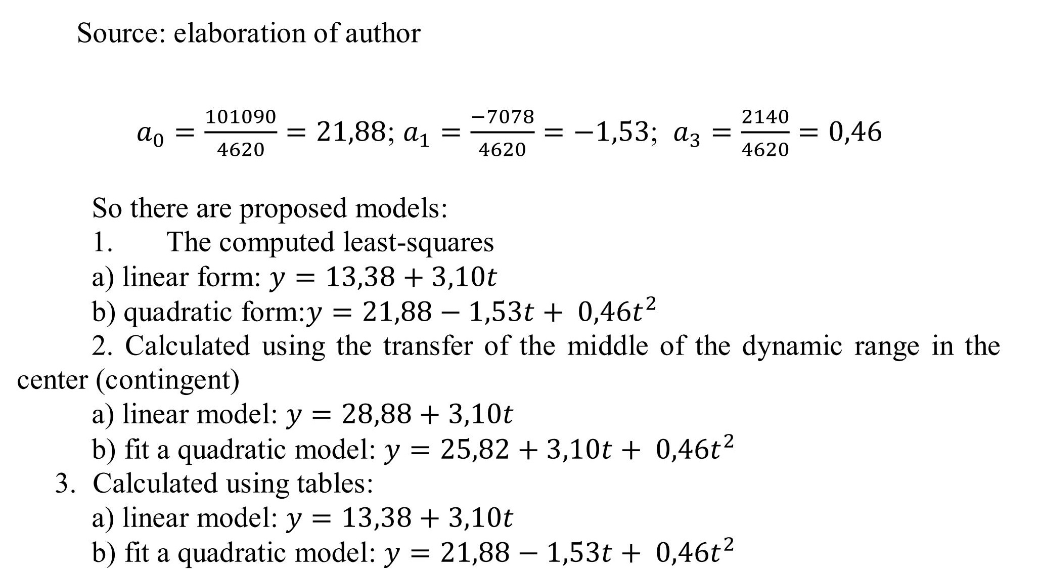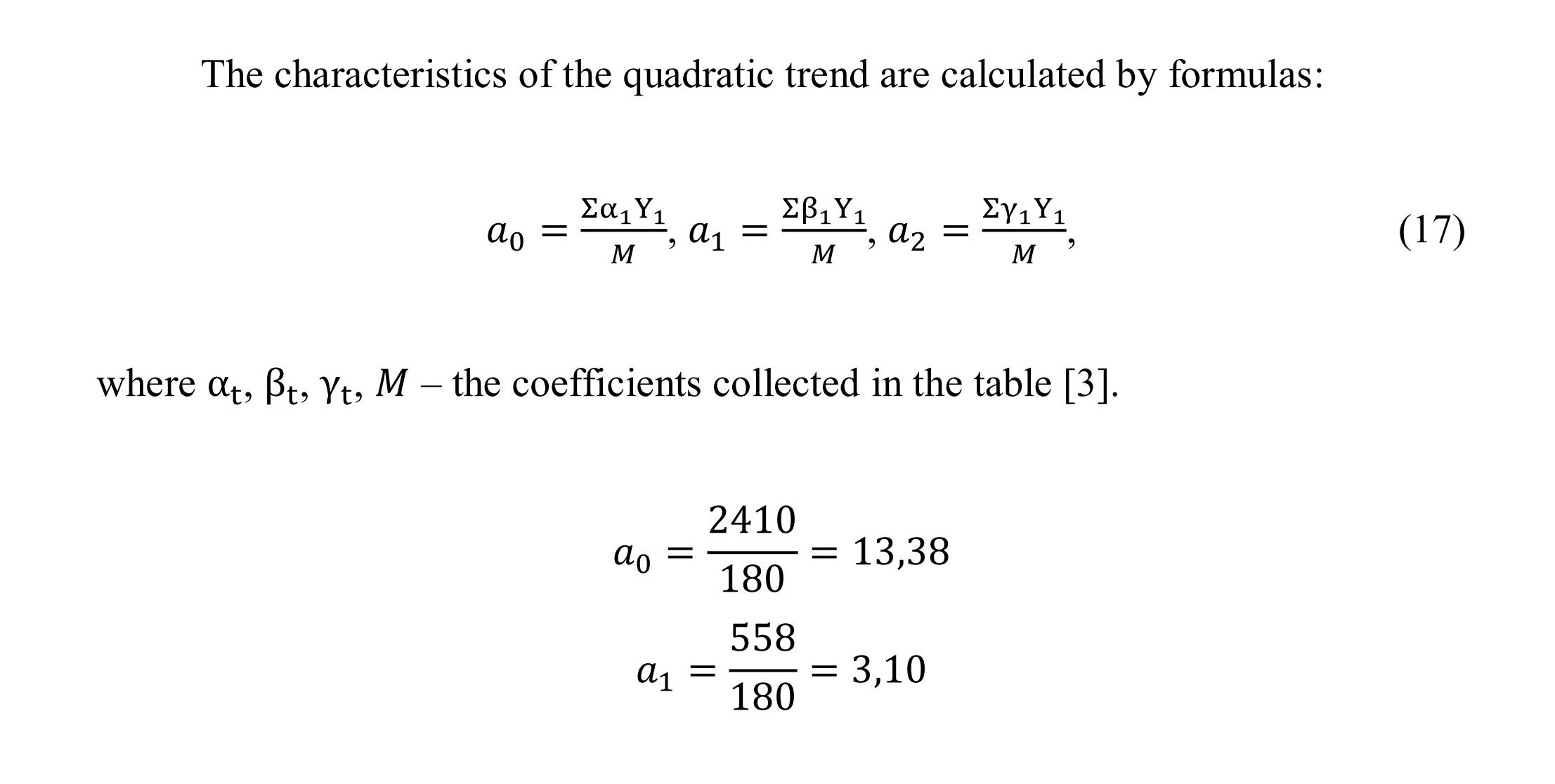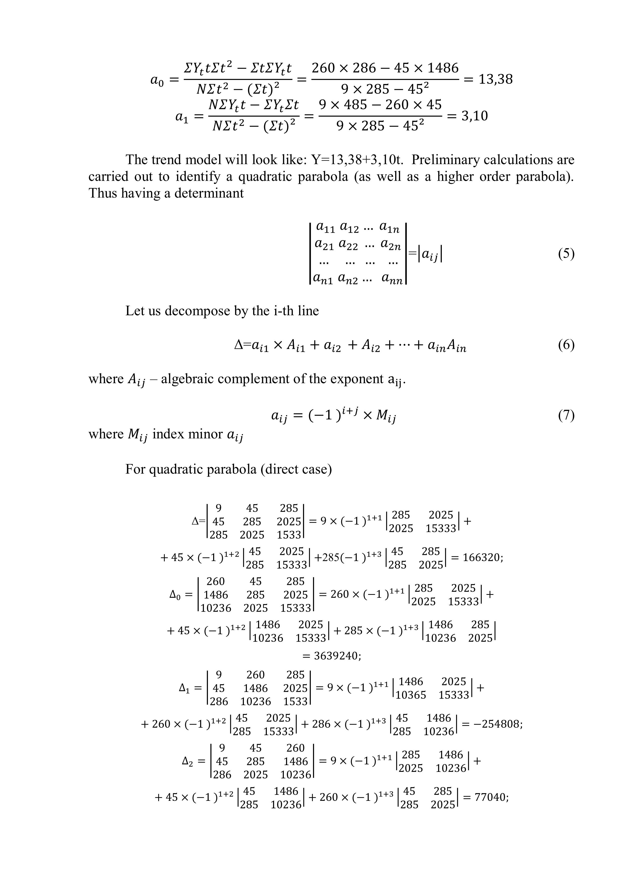 The trend model will look like: Y=13,38+3,10t. Preliminary calculations are carried out to identify a quadratic parabola (as well as a higher order parabola). Thus having a determinant