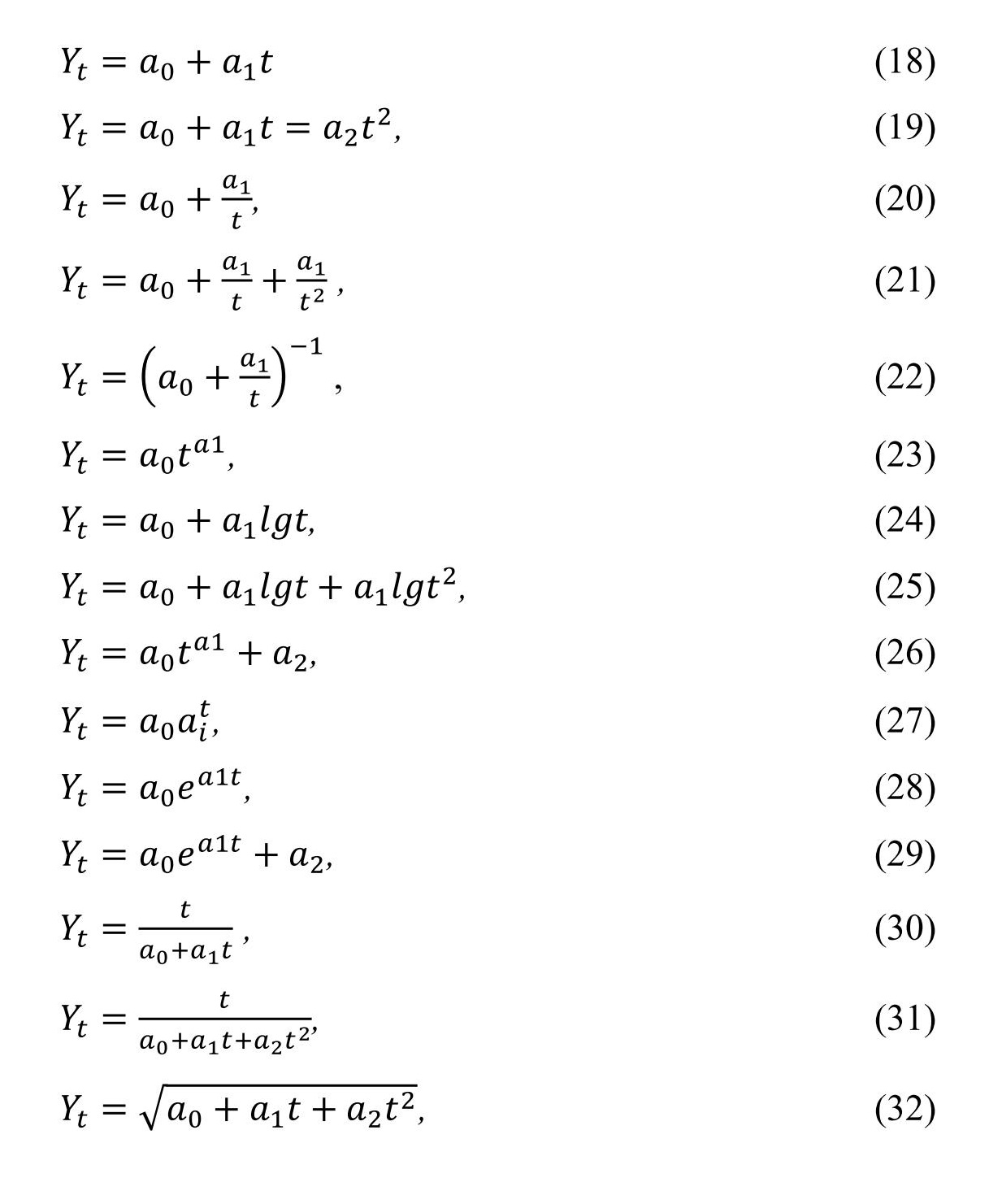 Trend models characterize the dependence of the members of the time series of characteristics of statistics on the number of the year and have the form [3]