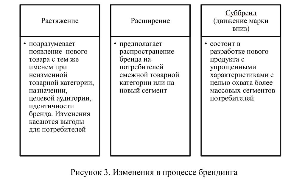 Согласно данным рисунка 3 видно, что растяжение подразумевает появление товара под тем же брендом при неизменной товарной категории, назначении, целевой аудитории, идентичности бренда. Изменения при растяжении бренда касаются выгод потребителей. Расширение бренда предполагает распространение на потребителей смежной товарной категории или на новый сегмент рынка. Движение марки вниз или создание суббренда состоит в разработке нового продукта с упрощенными характеристиками с целью охвата более массовых сегментов потребителей.