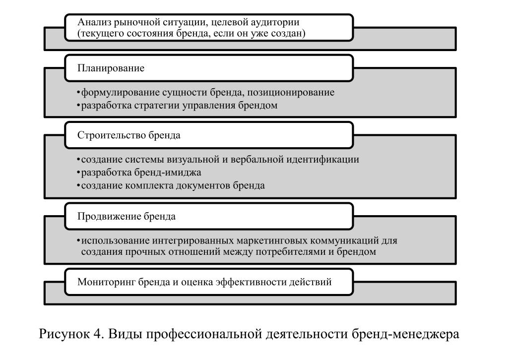 Комплекс работ и специфика брендинга предопределяют виды профессиональной деятельности бренд-менеджера. На специалиста брендингового агентства возлагается комплекс работ по анализу рынка, в частности, это может быть как исполнительская работа, так и организационная (аутсорсинг, аутстаффинг, обработка исходных данных сторонних маркетинговых исследований в зависимости от целей и масштаба). Работа по планированию на различные временные горизонты предполагает наличие знаний, умений и навыков в сфере маркетинга, продаж, продвижения, менеджмента и психологии потребителей. К видам деятельности по строительству бренда привлекается группа квалифицированных специалистов в области дизайна и графики (для разработки атрибутики бренда) [4, с. 30], типографии, маркетинга, маркетинговых коммуникаций, специалистов отдела продаж, и смежных областей вплоть до привлечения специалистов креативного отдела с целью выделения бренда среди продуктов-конкурентов [7]. Технологии продвижения бренда состоят в использовании интегрированных маркетинговых коммуникаций для создания прочных отношений между потребителями и брендом. Одним из инструментов продвижения является продакт-плейсмент, позволяющий сформировать имидж торговой марки через ассоциирование с персонажами кино, телевидения, взаимодействующими с продуктом [6, с. 5].