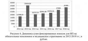 При введении упрощенной системы налогообложения и единого налога на вмененный доход, делалась ставка на сведение к нулю сложностей ведения бухгалтерского учета и составления налоговых деклараций, которые были под силу исключительно профессионалам. Большинство предпринимателей перешли на предложенные системы, при этом каждый из них отметил значительное снижение нагрузки, но величина налогов по-прежнему остается достаточно высокой и неподъемной для стартующих бизнесменов. И в данном случае – это прежде всего взносы на обязательное пенсионное и медицинское страхование в виде фиксированных платежей. Их размер с каждым годом увеличивается и никак не зависит от суммы дохода индивидуального предпринимателя (рисунок 4). Если в 2002-2006 гг. их размер составлял 1832 рубля в год, то в 2012 г. их величина составила 17208 руб. 25 коп., т.е. произошло увеличении более чем в девять раз. Данное повышение условно можно считать увеличением налоговой нагрузки на индивидуальных предпринимателей и о поддержке малого бизнеса через налоговое регулирование говорить не приходится. Более того с 2015 г. еще был дополнительно введен 1% от суммы дохода ИП, превышающей 300000 рублей в год, но не более 148 886,40 руб., с 1 января 2018 г. - не более 212360 руб. Такая непосильная для малого бизнеса сумма страховых взносов напрямую препятствует развитию малого бизнеса.
