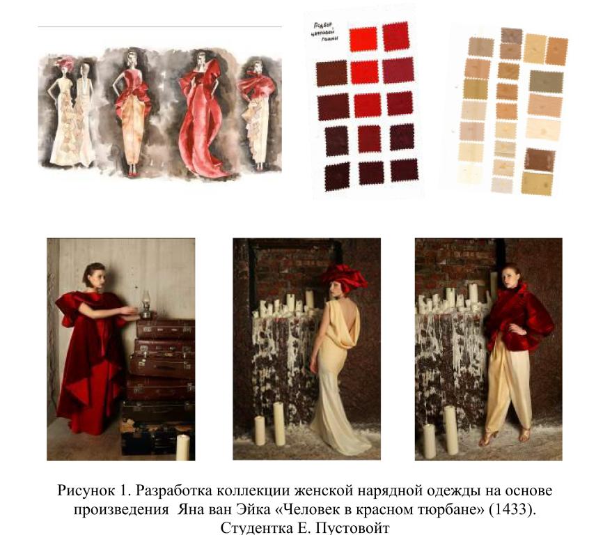 Параллельно с анализом и определением цветовой гаммы произведения, необходимо было выяснить новые модные тренды в цвете и фактурах материалов. Далее следовало сделать отбор приоритетных цветовых сочетаний, которые отражают основной колорит картины и соответствуют модным тенденциям. Также необходимо сделать выборку аналогов современных материалов и принципов их обработок, подобных фактурам, использованных в произведении – источнике.