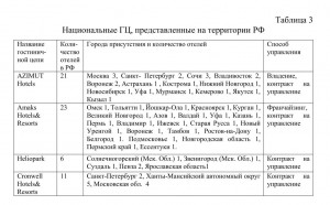 Также следует отметить, что на территории РФ география национальных ГЦ шире (отели представлены в 42 городах), чем география зарубежных (в 35 городах). Так, можно отметить, что национальные ГЦ не боятся размещать свои отели в городах, которые не пользуются большим туристским спросом, в отличие от зарубежных ГЦ (например, Азов, Тамбов, Белгород, Пермь). Более того, прослеживается тенденция увеличения популярности курортных отелей в экологически чистых местностях (например, ГЦ Cronwell Hotels&Resorts открыла парк-отель в пос. Добрино, Тюменской области, он расположен на уникальной территории, которая отличается множеством экологически чистых озер и лесных массивов). Однако количественные показатели говорят о том, что число отелей под управлением национальных ГЦ совсем не велико – 54, и только в 10 городах находится более чем один отель под управлением российской ГЦ. Тем не менее, национальные ГЦ активно распространяют свое присутствие на гостиничном рынке РФ и имеют перспективы дальнейшего развития. ГЦ Amaks Hotels&Resorts имеет наибольшее количество отелей и самую широкую географию их распределения по городам РФ – 23 отеля в 23 городах. ГЦ AZIMUT Hotels представлена 21 отелем в 14 городах РФ, разместив по несколько отелей в самых популярных туристских центрах (Москва, Санкт-Петербург, Сочи). В свою очередь, ГЦ Cronwell Hotels&Resorts делает акцент на курортных отелях, в определении размещения которых ключевую роль играет экологически чистая территория. ГЦ Heliopark имеет самый низкий показатель по количеству отелей – шесть, два из которых являются бизнес-отелями, а остальные четыре – загородными отелями (например, спа-отель HELIOPARK Thalasso в г. Звенигород, Московская область – ориентирован на организацию оздоровительного отдыха) (таблица 3).