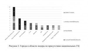 При анализе географии ГЦ в РФ, также можно отметить, что отели расположены крайне неравномерно. В столице число гостиниц под управлением зарубежных ГЦ достигает 62, поэтому она является безусловным лидером по данному критерию. Но при этом, во многих больших городах либо областных центрах не представлено ни одной гостиницы под управлением зарубежного гостиничного оператора (Тольятти, Барнаул, Владивосток, Томск, Оренбург) ввиду недостаточной аттрактивности или осведомлённости о данных городах в контексте видения их как бизнес- или турцентров, привлекающих турпотоки.
