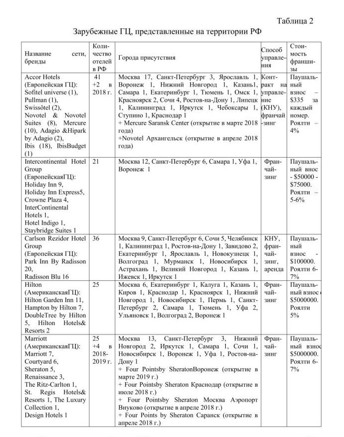 Тем не менее, зарубежные ГЦ достаточно активно осваивают гостиничный бизнес РФ, одним из катализаторов этого процесса выступают события мирового масштаба. Примером может служит Чемпионат мира по футболу 2018 г., который будет проводится в 11 городах России: Волгограде, Екатеринбурге, Казани, Калининграде, Москве, Нижнем Новгороде, Ростове-на-Дону, Самаре, Санкт-Петербурге, Саранске, Сочи. На данный момент в 10 городах (кроме города Саранск) функционируют гостиницы, входящие в международные цепи. На ближайшее время запланировано открытие двух гостиниц в Саранске под управлением Accor Hotelsи одного отеля, входящего в цепь Four Points by Sheraton. Данные о зарубежных ГЦ, брендах, которыми они представлены на территории РФ, количестве гостиниц, городах присутствия, способах управления представлены в таблице 2.
