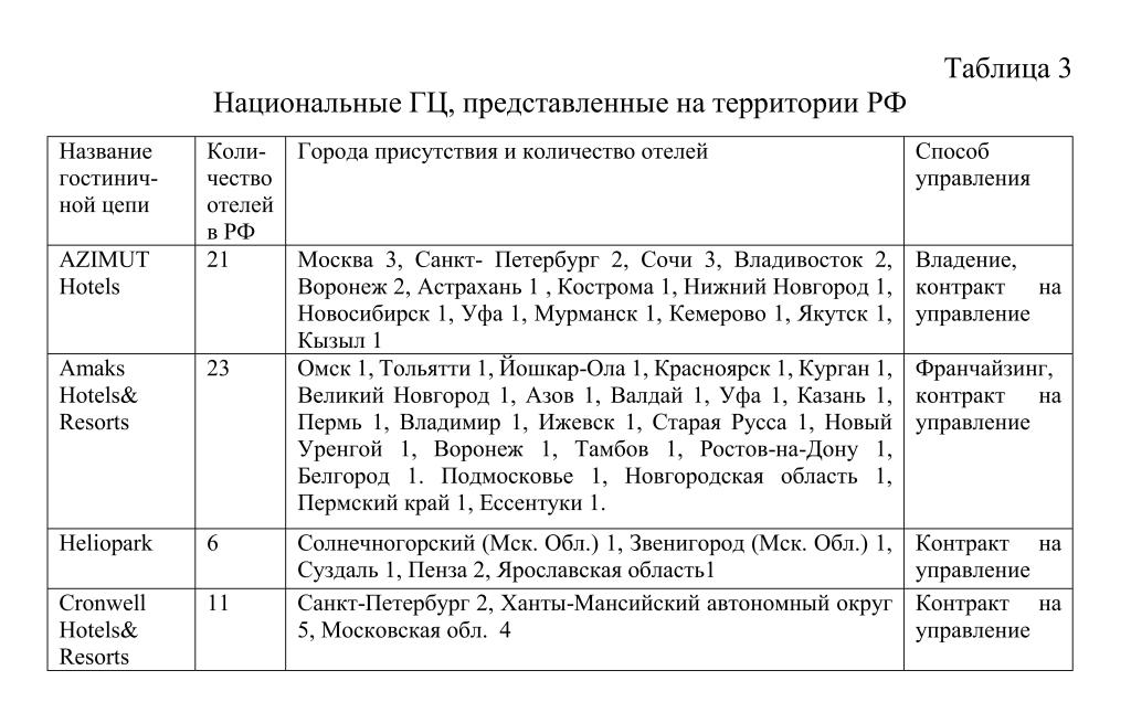 Также следует отметить, что на территории РФ география национальных ГЦ шире (отели представлены в 42 городах), чем география зарубежных (в 35 городах). Так, можно отметить, что национальные ГЦ не боятся размещать свои отели в городах, которые не пользуются большим туристским спросом, в отличие от зарубежных ГЦ (например, Азов, Тамбов, Белгород, Пермь). Более того, прослеживается тенденция увеличения популярности курортных отелей в экологически чистых местностях (например, ГЦ Cronwell Hotels&Resorts открыла парк-отель в пос. Добрино, Тюменской области, он расположен на уникальной территории, которая отличается множеством экологически чистых озер и лесных массивов). Однако количественные показатели говорят о том, что число отелей под управлением национальных ГЦ совсем не велико – 54, и только в 10 городах находится более чем один отель под управлением российской ГЦ. Тем не менее, национальные ГЦ активно распространяют свое присутствие на гостиничном рынке РФ и имеют перспективы дальнейшего развития. ГЦ Amaks Hotels&Resorts имеет наибольшее количество отелей и самую широкую географию их распределения по городам РФ – 23 отеля в 23 городах. ГЦ AZIMUT Hotels представлена 21 отелем в 14 городах РФ, разместив по несколько отелей в самых популярных туристских центрах (Москва, Санкт-Петербург, Сочи). В свою очередь, ГЦ Cronwell Hotels&Resorts делает акцент на курортных отелях, в определении размещения которых ключевую роль играет экологически чистая территория. ГЦ Heliopark имеет самый низкий показатель по количеству отелей – шесть, два из которых являются бизнес-отелями, а остальные четыре – загородными отелями (например, спа-отель HELIOPARK Thalasso в г. Звенигород, Московская область – ориентирован на организацию оздоровительного отдыха) (таблица 3).