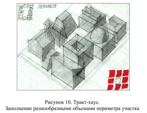 - вместо одного большого дома создается композиция из отдельных разнородных элементов, рассредоточенных по вытянутому прямоугольному участку в 20 соток,