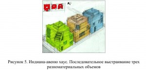 В проекте лофтов на Индиана-Авеню (Венеция, Калифорния, 1979-1981 гг.) Гери продолжает разрабатывать тему квартир-студий для художников. Три обособленных дома-мастерских находятся в густо населенном и малообеспеченном районе Венеции в Калифорнии. Три блока выстроены в ряд на узком участке, два из них имеют прямой доступ в гараж. Каждый из блоков несет в себе отсылки к региональной архитектуре 1930-х годов. «Дизайнерские элементы на каждом из трех объемов дома- эркер в одном, дымоход в другом и лестница в третьем-абстрактные скульптуры. Увеличенные в масштабе относительно своих привычных форм, такие элементы придают относительно большим зданиях эффект миниатюрности» [4, с. 208]. Конструкции — деревянный каркас на бетонном фундаменте. Дом спроектирован с возможностью пристройки новых объемов. Как и в доме Рональда Дэвиса, Гери создал пространство-оболочку, которое должно быть заполнено содержанием, привносимым его владельцем. Гери в шутку называл эти три объема «тремя поросятами» (см. рисунок 5).