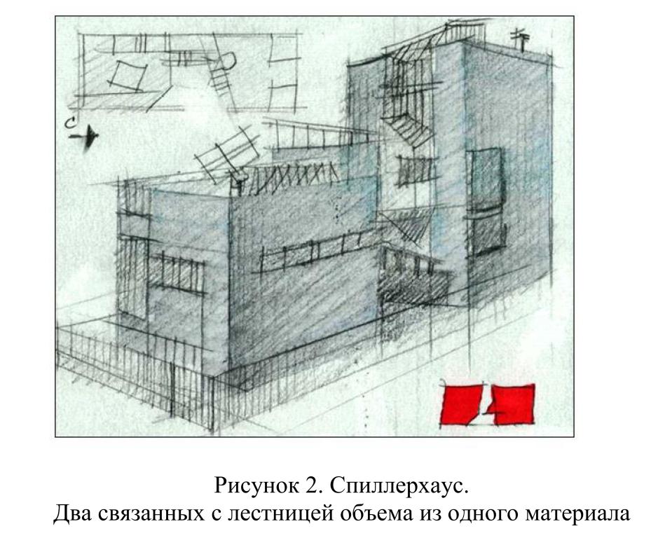 Многообразие толкований созданных Гери архитектурных сооружений традиционно. В этом угадывается соответствие его построек абстрактным произведениям искусства, здесь можно вспомнить нелюбовь архитектора к однозначно присваиваемым ему стилевым принадлежностям. В истории индивидуального домостроения Гери данный объект находится между двумя знаковыми постройками: радикальной перестройкой собственного дома в Санта-Монике, 1978 г. и резиденцией Нортона на венецианском пляже, 1984 г. Дом Джейн Спиллер устанавливает контакт со своим предшественником и преемником. Он сохраняет резкие повороты форм, используемые материалы и нонконформизм первого, но еще воздержан от эксцентричного использования масштаба и многоцветности второго (см. рисунок 2).