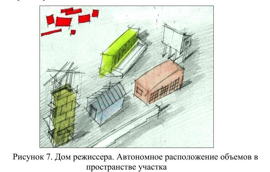 - вместо одного большого дома создается композиция из отдельных разнородных элементов, рассредоточенных по вытянутому прямоугольному участку в 20 соток,
