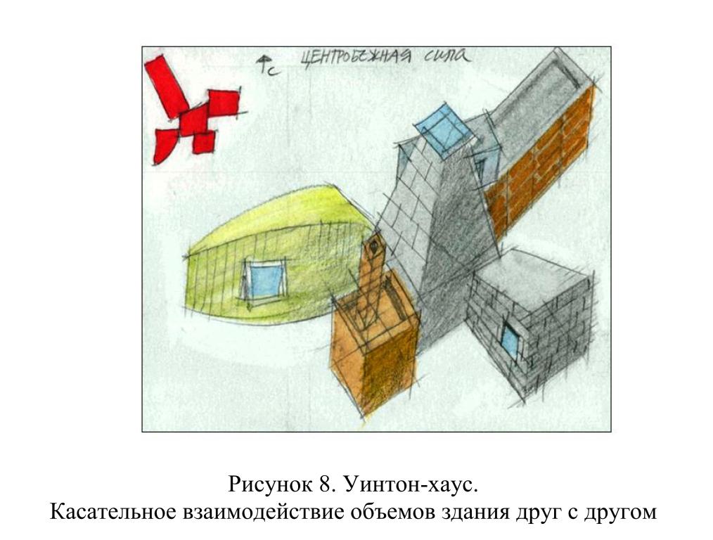 В проекте резиденции Фамилиана Гери 1977-1978 гг., например, основные массы формируют чисто супрематистское скопление, напоминая «Красный квадрат и черный квадрат» Малевича; и уединенные зоны в форме перекладины соответствуют типичному супрематистскому формату. Формы соединяются мостами, вроде эскизов декораций конструктивистов, как проект Любови Поповой для «Великодушного рогоносца». Две формы резиденции Фамилиана имеют сбалансированное напряжение: «Одно главное здание, 40х40 футов в плане, по сути, является объемом, отведенным для общественных собраний. Второе главное здание имеет в плане 20х110 футов и включает в себя частные/приватные функции на третьем этаже». В здания посредством отношений между формами заложены эмоциональные качества. Так, в общественных зонах куб прорывается сквозь крышу, мосты врезаются в стены с двух сторон, а угол обнажен догола. Длинная форма более сдержанна, спокойна; она получает импульс от моста только на одном конце, держа другую форму в страхе, не подпуская другую форму. Малевич стремился к тому же отношению между своей красной фигурой – с непрямым углом, не совсем квадратной, меньшей и более подвижной – и более стабильным, спокойным черным квадратом (тоже не прямоугольным, но только слегка). Гери уточнил в подробных и характерных терминах то, что Малевич заявил в общем и идеализировал однажды.