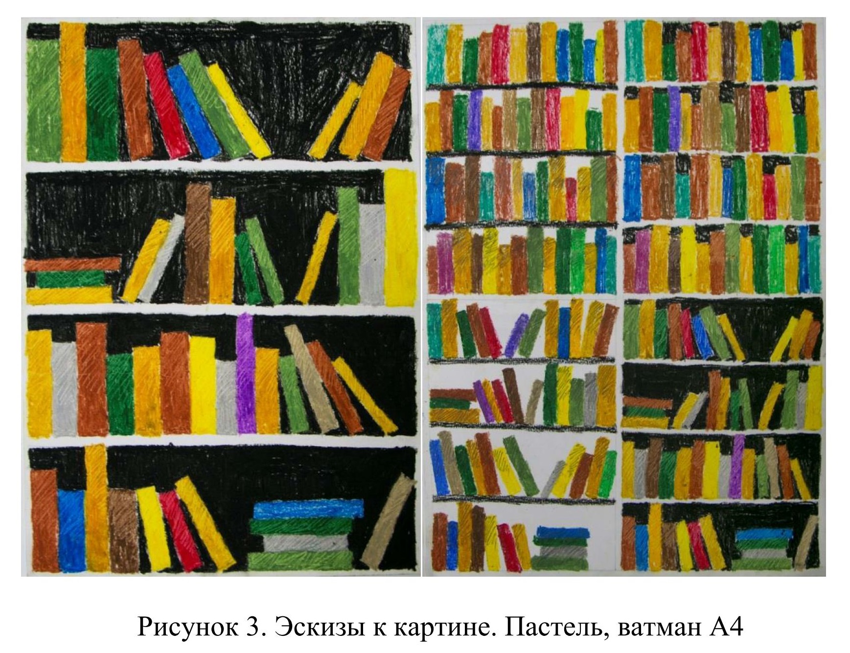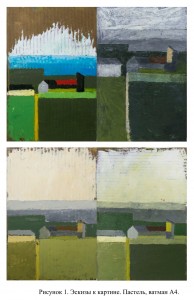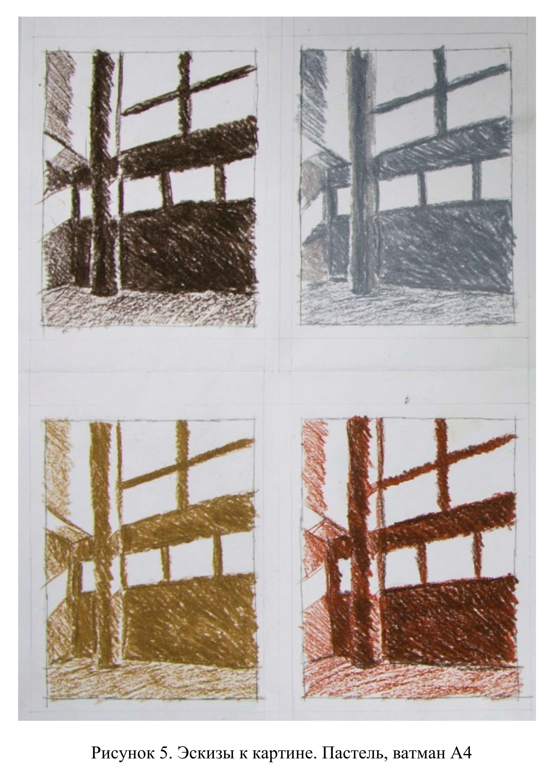 Заданием для студентов 3 курса было создание работы в технике масляной живописи размером 60 на 80 сантиметров (рисунки 3-5). Самостоятельно был собран подрамник, натянут, проклеен и загрунтован холст. Предварительные эскизы выполнялись в технике масляной пастели от малого формата А5, постепенно увеличиваясь до формата А3 (рисунки 6-8). Сложность и интерес задачи заключалась в переводе изображения из одной техники в другую. В итоге были получены эскизы масляной пастелью и холсты, написанные масляными красками.