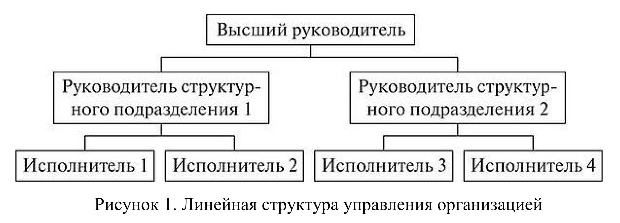 - Линейная организационная структура (рисунок 1) характеризуется вертикальными связями: высший руководитель — линейный руководитель структурного подразделения — исполнители. Данная структура характерна для небольших организаций.