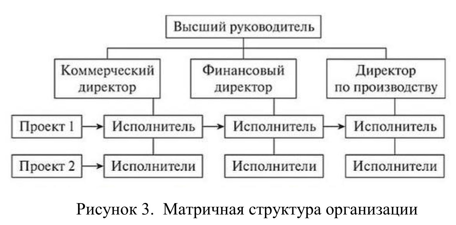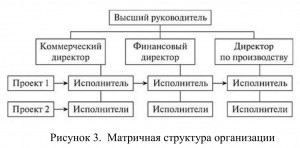- Современный эффективный тип организационной структуры управления, который создается путем совмещения структур различных видов, — матричная структура управления (рисунок 3). Суть матричных структур состоит в том, что в действующих структурах создаются временные рабочие группы, при этом руководителю группы в двойное подчинение передаются ресурсы и работники других подразделений.