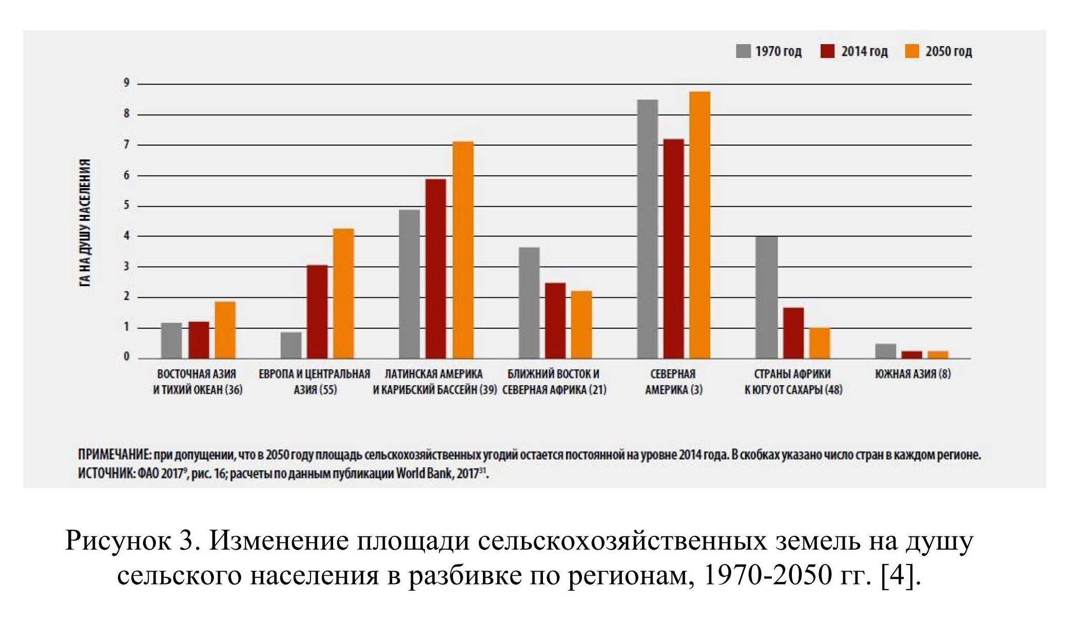 Анализ данных позволяет утверждать, что динамика изменения площади сельскохозяйственных угодий, на душу населения по разным регионам мира за прошедшие периоды с 1970 г. по 2014 г. и прогноз динамики до 2050 г. существенно рознятся.