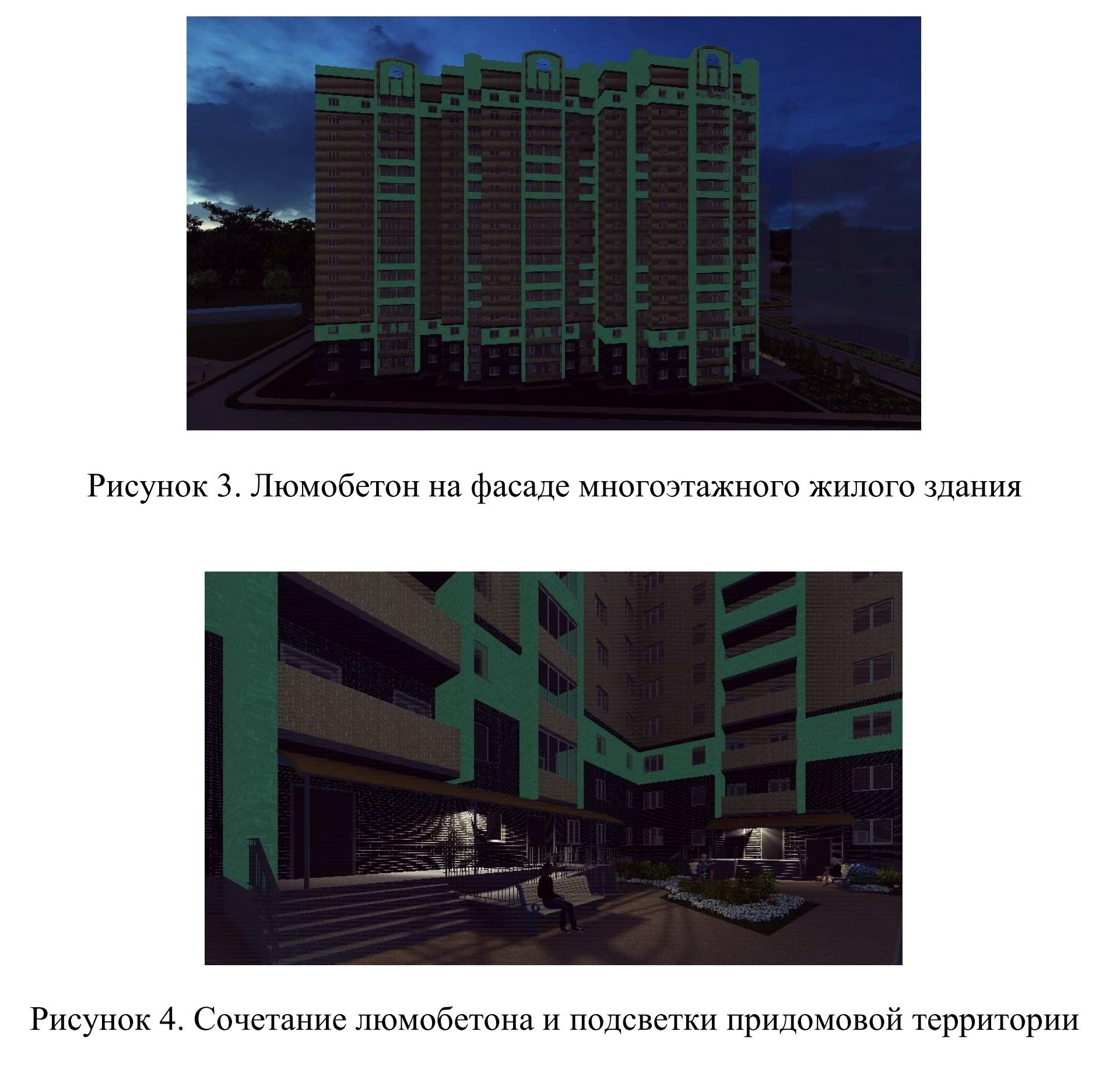 На рисунке 4 представлен вид дворовой территории с придомовым освещением подъездов. Размещение придомовой подсветки может быть частично снижено из-за компенсирующей яркости свечения люминесцентного камня. Раскрытие материала в рамках рассмотренного метода проектирования свидетельствует не только о сохранении объёма и естественной формы объекта, но и о формировании архитектурной иллюзии, работающей в разное время суток.