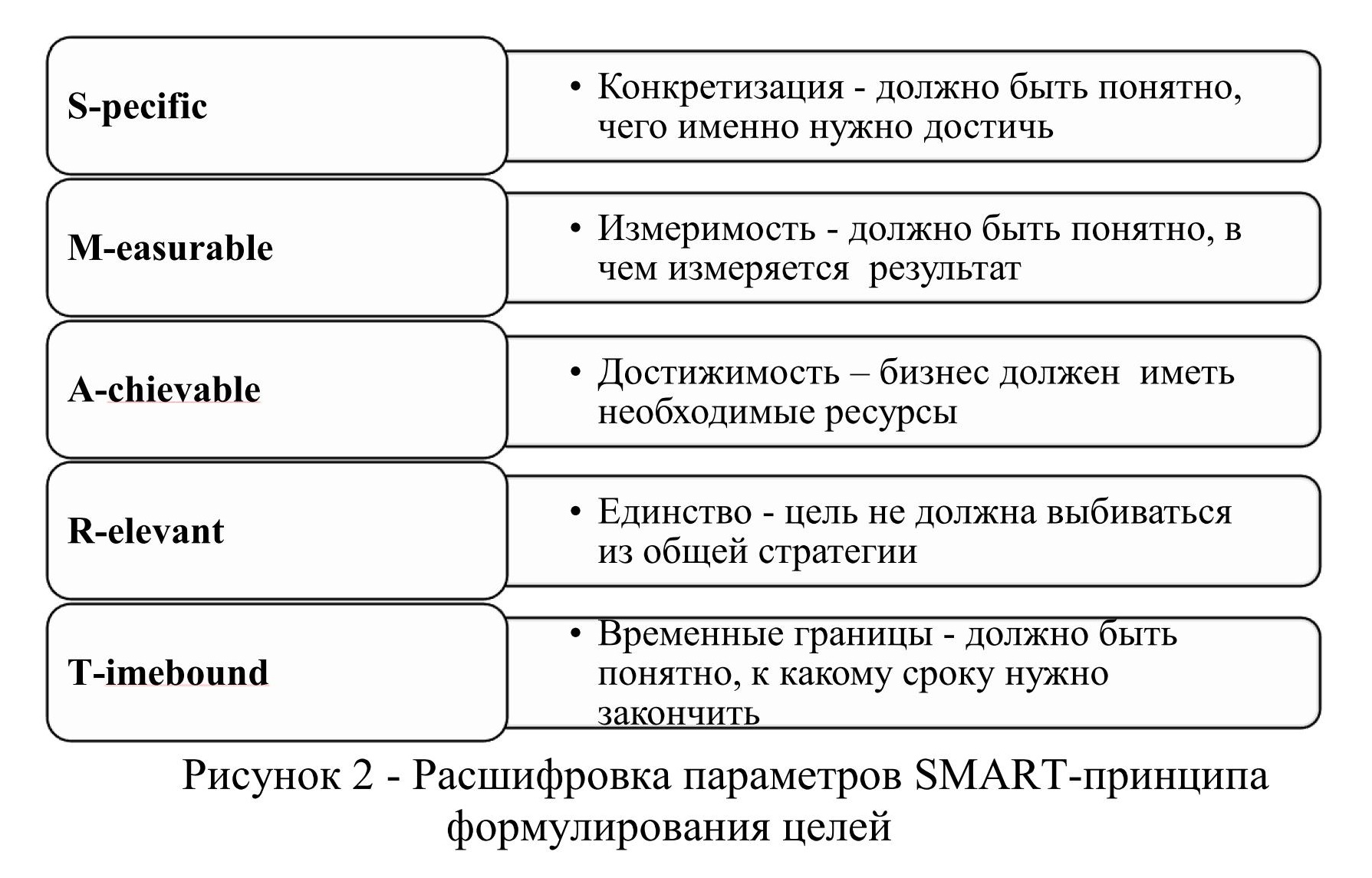 Предприятие, занимающееся развитием бренда, должно четко понимать, каких целей оно должно в итоге достичь, как в краткосрочном периоде, так и на долгосрочную перспективу. Для этого эффективно применять методы формулирования целей. Одним из наиболее распространённых и эффективных методов является SMART-принцип. Каждый элемент в системе имеет ключевое значение для осознания формирования и достижения цели предприятия. Общее описание параметров представлено на рисунке 2.