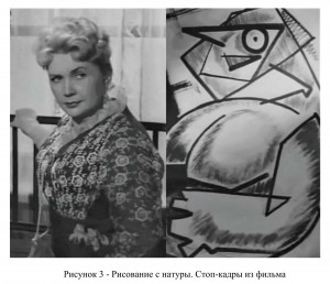 Следующий кадр демонстрирует сам процесс создания «нового искусства». Дама бальзаковского возраста позирует, а художник, весело размахивая кистью, создает полотно, на котором мы видим нечто подобие одноглазой Снежной бабы, у которой вместо рта треугольник. У одного из посетителей – свидетеля этого «творчества» буквально округляются глаза от увиденного. Последний штрих, который делает художник, завершая «полотно» - два решительных мазка средним и указательным пальцами вдоль и поперек полотна (см. рисунок 3).