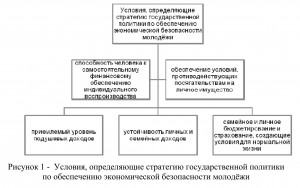 Осознание вышеуказанных угроз становится причиной для формирования стратегии государства в области обеспечения экономической безопасности молодёжи. Как отмечают в своей научной статье ряд российских ученых-исследователей (А.А. Бурмистрова, И.С. Кондрашова, Н.К. Родионова): «Государственная стратегия экономической безопасности Российской Федерации заключается в восстановлении в России экономического роста на новой основе и с помощью новых институтов рыночной экономики, обеспечения гарантированной защиты национальных интересов, социальной направленности политики, достаточного оборонного потенциала даже при неблагоприятных условиях развития внутренних и внешних процессов» [3, c. 5-8]. Данная стратегия предполагает необходимость учета ряда условий, определяющих механизм выстраивания работы по обеспечению экономической безопасности молодёжи.