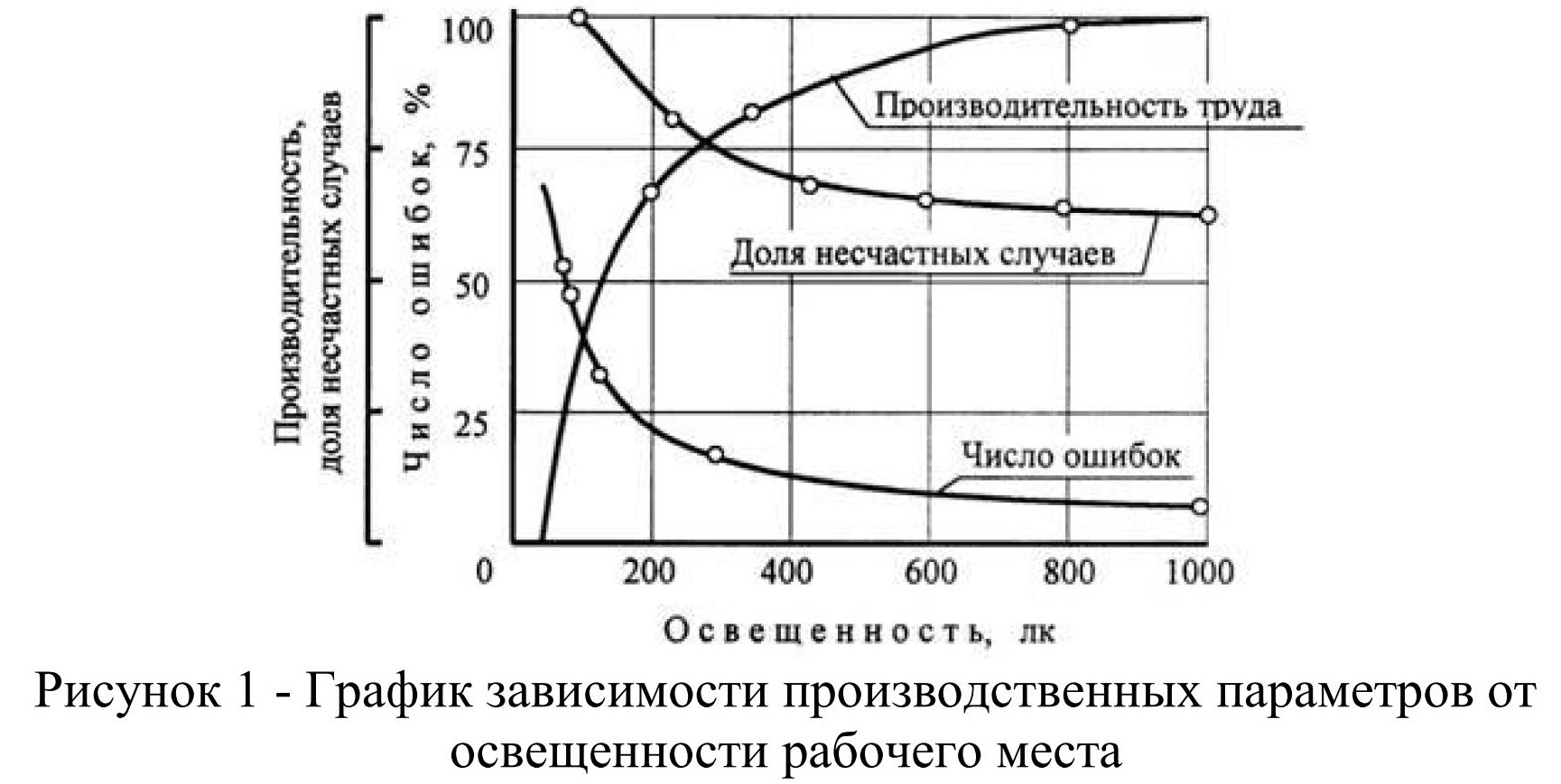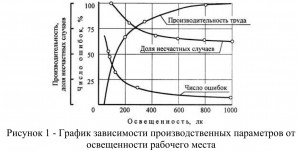 По данным НИИ труда, увеличение освещенности от 100 до 1000 лк при напряженной зрительной работе способствует повышению производительности на 10—20%, уменьшению брака на 20%, снижению количества несчастных случаев на – 30 % [1].
