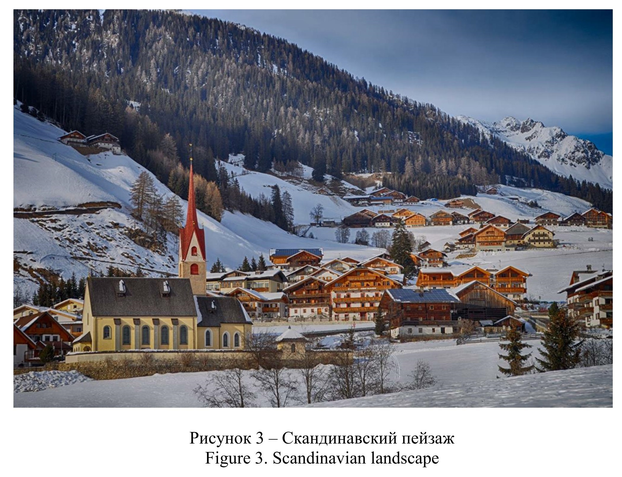 Современная архитектура Северной Европы точно так же отвечает основным принципам скандинавского функционализма: она геометрична, проста и накрепко связана с окружающей её природой, согласована с ней. При упоминании таких стран, как Норвегия или Дания, в первую очередь вспоминаются аккуратные ряды ярких миниатюрных домов, контрастирующих с заснеженными хвойными лесами (рисунок 3).