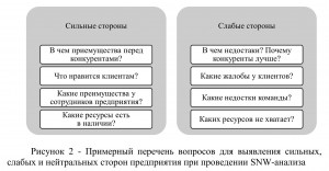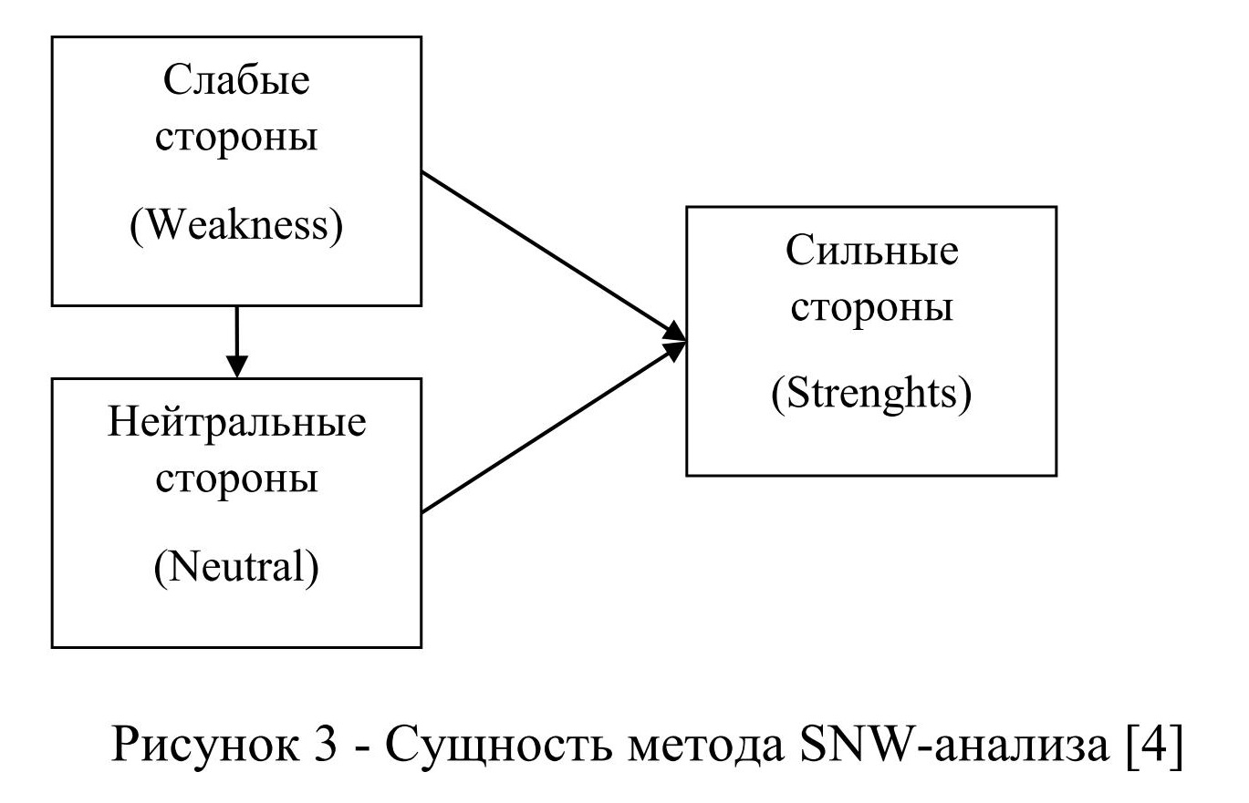 Одним из методов ситуационного анализа факторов внутренней среды предприятия является SNW-анализ, суть которого состоит в выявлении сильных, нейтральных и слабых сторон деятельности предприятия, относящихся к факторам внутренней среды. Данный метод сфокусирован на анализе именно внутренних составляющих, включающих организационные, кадровые, технические, технологические условия работы и представляет собой результат принятия управленческих решений [7].